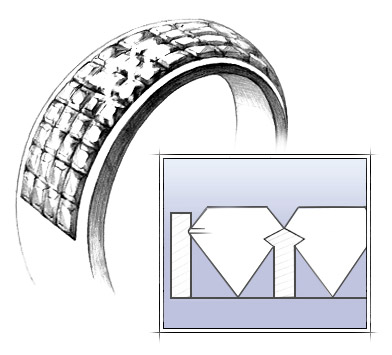 The design itself can be realized through the consultative process with a jewelry professional who has experience in communicating your desires to a bench person who can create, from a pencil sketch and conversation the finished article you envisioned.